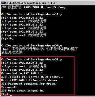 首先,在命令行或DOS窗口中输入“ftp”命令并敲回车,然后在“ftp>”提示符后面敲入“open 192.168.0.1 port”(port是FTP服务器的端口号),此时命令行等待我们输入用户名,输入合法的用户名后再输入相应的密码,这时我们就可以登录FTP服务器了(图3)。