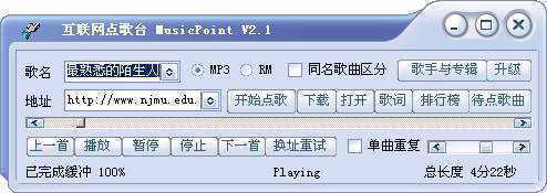 互联网点歌台是国内第一款具有在线点歌功能的工具,利用其自身的搜索功能可以搜罗网上的所有相匹配的歌曲,并利用RealPlayer控件来播放.mp3和.rm格式的音乐,还可以通过内置的下载功能将音乐下载到自己的硬盘中(支持断点续传)。在其最新的2.1版本中,采用了MPT-Link自动换址技术,大大提高了在线点播的成功率。