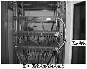 另外,由于所有的交换机之间都只有一条链路,这样,其中任何一台交换机、连接端口或级联线缆发生故障时,都将导致整个网络通信的中断。为了提高网络的稳定性,可以在首尾两台交换机之间再连接一条线缆作为链接冗余(图3)。当某一台交换机发生故障时,冗余线缆立即被激活,从而保障网络的畅通。