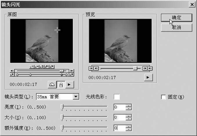 《会声会影》所拥有的滤镜设置相当灵活,如在自定义设置“镜头闪光”滤镜对话框中(如图2),先拖动原图窗口中的滑块(或直接播放)找到要设置的帧,单击“添加关键帧”按钮添加一个关键帧,再设置对话框下面的亮度、大小、额外强度等数值,倘若上述值都为0,则在作品中所看到的效果是光晕从大到小且在关键帧处消失。