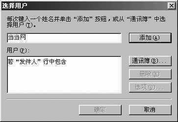 5.在“规则说明”中,单击蓝色带下划线的文字,弹出“选择用户”对话框,在上边的栏内输入包含的用户文字“当当网”(如图3所示)。接着单击“添加”按钮,再单击“确定”按钮。