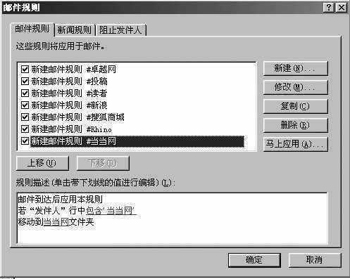 8.以上设置的规则意思是:当收到的新邮件中的发件人中包含有“当当网”时,就自动将此邮件放到收件箱子级的“当当网”文件夹中。单击“确定”按钮。接着,我们可以继续单击“新建”按钮,建立新的邮件规则(如图5所示)。
