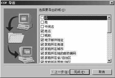 4.弹出“CSV导出”对话框,单击“浏览”按钮,选择存储路径并输入文件名,格式为.csv,单击“确定”按钮。接着单击“下一步”按钮,又弹出“CSV导出”对话框(如图7所示)。勾选你要导出的域,单击“完成”按钮即可。