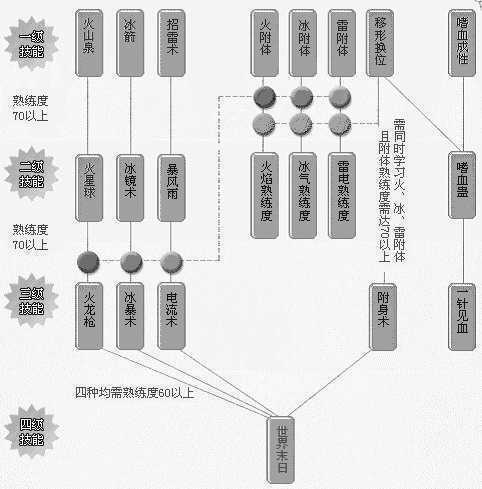 除了虔诚信仰暗灵之神外,更沉醉于暗灵之神的各种神秘法术研究。而经过时代的变迁,已经渐渐开始出现能自由控制各种元素力量和人体力量的教徒,传说中暗灵之神留有一本巫毒秘典,这些教徒的能力都来自于秘典。此职业能力值重敏、智(新增之能力值、增加气力用)。大部分的装备及武器均不可使用。暗灵法师技能见图1。