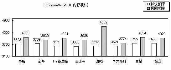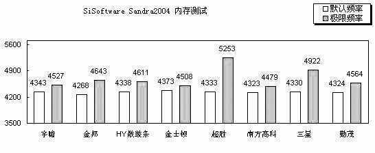 相对ScienceMark2.0来说,SiSoftware Sandra2004对于延迟并不是非常敏感,得分受频率的影响更大,因此,极限频率排名第一的超胜和第二的三星在这项测试中表现突出,超胜的得分提升了21%,三星得分提升了13%。频率为433MHz的金邦、勤茂也表现不错,分别拿下第三和第四。