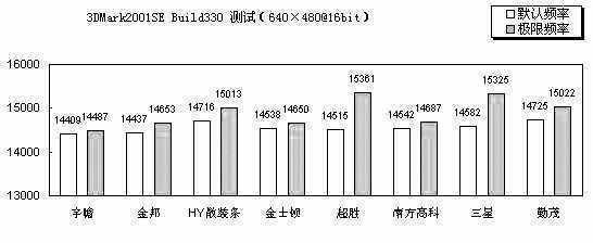 在低分辨率下,3DMark2001SE Build330对于显卡的负担减小了,此时内存带宽的变化对于测试得分的影响相对高分辨率环境下就要明显许多。不容置疑,超胜DDR400在本项测试中仍然排到了最前面,460MHz的三星位居亚军,两者的性能提升都在5%左右。排在第三位的还是勤茂,性能提升幅度为2%,超过了同为433MHz的金邦和宇瞻。频率为410MHz的南方高科以略低的延迟值艰难地超过了频率为420MHz的金士顿。