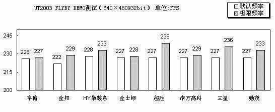 考验内存带宽在实际应用中表现情况的Quake3还有UT2003的测试结果基本上与3Dmark2001SE相同。超胜、三星分别排名第一、第二,第三由勤茂和HY散装条并列。高频率带来的高内存带宽使得系统在游戏中的速度得到明显的提升。就幅度来说,超胜25%的频率提升带来了5%的性能提升,三星15%的频率提升也得到了4%的性能提升。