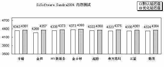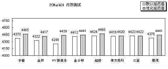 PCMark04通过对内存的读写来考查内存的带宽。从图中可以看到,默认延迟值下,超胜DDR400的表现最为突出,另外,默认延迟值最低的南方高科紧随其后,成绩也不错。本项测试中,金邦的DDR400落到了最后,与最快的超胜的差距达到了2%。在优化延迟值下,超胜DDR400依然独占鳌头,超过了延迟值最低的金士顿。宇瞻DDR400的表现也很不错,与超胜只有微不足道的3分的差距。在默认延迟值下,HY散装条的表现最差。