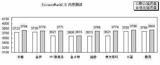 ScienceMark2.0可以针对内存、CPU的L1 Cache、L2 Cache进行带宽测试,并且能测试内存的延迟值,是一款很全面的内存测试软件。从ScienceMark2.0的测试结果来看,无论是默认延迟值还是优化值,勤茂DDR400的表现都最为突出,优化后的成绩超过得分最低的金士顿5%左右,排第二的是三星的DDR400,成绩也相当不错。金邦和宇瞻得分则居中,而且很接近,可以说基本在同一水平线上。金士顿、超胜、南方高科的默认延迟值的表现要稍弱一点,特别是金士顿DDR400,优化前后的性能提升幅度较小。