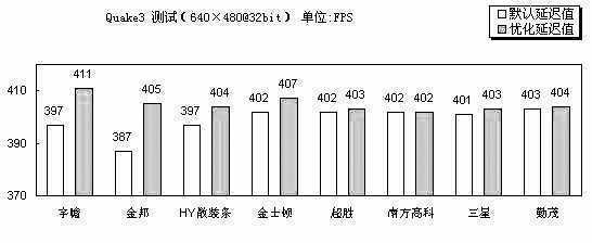 Quake3对于内存的敏感性也比较强,在本项测试中,宇瞻DDR400在优化后的性能提升明显,达到了411FPS的好成绩,另外,优化值很低(2-5-3-3)的金士顿也在优化后得到了407FPS的成绩,排在第二位,优化值同为2-5-3-3的HY散装条却落在其后,金邦DDR400在默认下的成绩不佳,好在优化后的性能提升幅度很大,排在了第三。