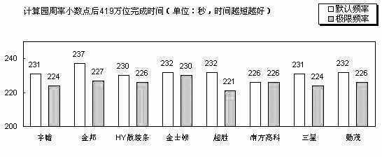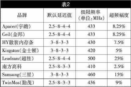 我们在默认延迟值下调整内存频率,得到每款内存能稳定工作的最高频率(见表2)。为了保证CPU在高外频下不影响系统的稳定性,我们增加了0.1V的CPU核心电压,而DDR内存电压保持在主板的2.6V默认值下。