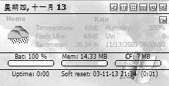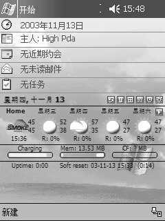 文件下载解压后,是一个名为TodayPlus.arm.CAB的文件,将该文件拷贝到PDA中,点击安装,在屏幕上会弹出“该程序与当前的操作系统不兼容……”的对话框,问你是否继续安装,点“是”继续安装。安装完毕,在PDA的屏幕上会显示如图1的界面,里面有天气预报,电池电量等信息。