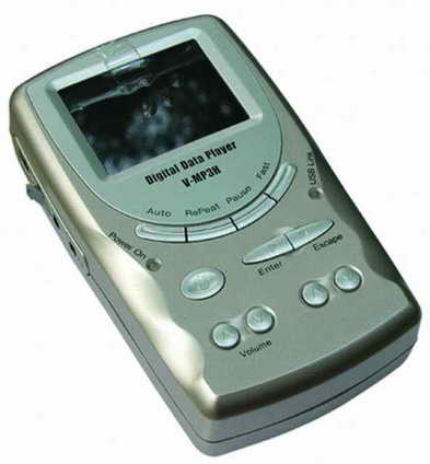 V-MP3H(图8)装配了2.5英寸TFT彩色液晶显示屏,支持CF/SD/MMC/IBM MicroDrive记忆卡,可以直接浏览数码相片,而且还可以播放MPEG1、VCD、MP3、JPEG等格式的文件;支持视频及音频的输出,扩大了产品的使用范围;内置7.2V、1350mAh锂电池,播放VCD时可连续工作2小时。