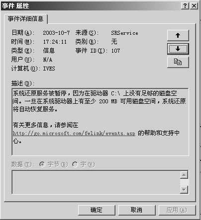还原点丢失后,启动“控制面板→管理工具→事件查看器”,在事件查看器中选择“系统”,找到丢失还原点的信息文件,查看属性看到:系统还原服务被暂停,因为在驱动器C:\上没有足够的磁盘空间,一旦在系统驱动器上有至少200MB可用磁盘空间,系统还原将自动恢复服务。(如图1)