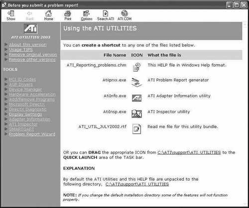 ATi UTILITIES 2003只有一个安装文件,安装默认路径为C:\ATi\support\ATi_UTILITIES。在安装完毕后会自动弹出一个chm格式的帮助文件(见图1),提示安装目录中几个文件的功能,我们可以看到,ATi_Reporting_problems.chm是一个帮助文件,通过这个help文件,我们可以获得若干的帮助,其内容覆盖也是相当的广泛,几乎涵盖显卡使用的方方面面。Atiiprxx.exe是一个ATi显卡的故障提交软件,AtiInfo.exe则是一个检测ATi显卡信息和系统信息的工具,AtiInsp.exe是一个检测ATi显卡的工具。