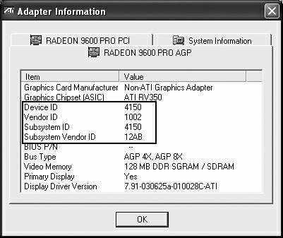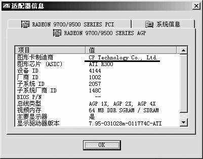 执行AtiInfo.exe,我们就可以看到检测到的显卡信息,例如制造厂商、显示芯片的代码、DEVICE VENDOR ID、DEVICE ID、SUB SYSTEM ID、SUB SYSTEM VENDOR ID、AGP接口类型(AGP 4×/8×)等。比较有用的就是这一系列ID号,只要是正规的ATi产品,都会有相应的ID号,例如对于很多所谓的“原厂”显卡,可以直接显示出代工厂的名称(见图2)。由于笔者采用的显卡为双敏Unika的火旋风9618显卡(ATi 9600显示芯片),该卡采用非公版的设计,所以我们可以看到该软件并没有直接检测到制造商的信息。不过要知道制造厂商也不难,因为一系列的ID已经告诉我们这款显卡的“出生地”。