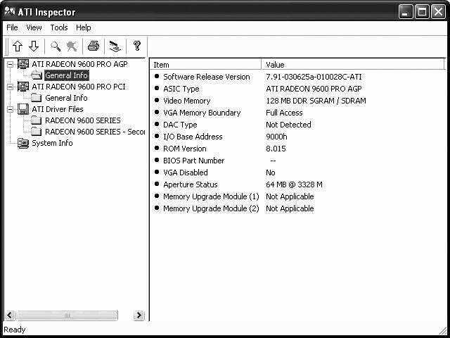 接下来我们就来看看AtiInsp.exe的作用,执行这个文件之后,我们可以检测到显卡的整体详细信息,例如显存容量、类型和显存的频率以及显卡占用的资源(I/O地址)等信息,甚至还有显卡BIOS的版本和显示驱动的一些详细信息。通过这种检测,让我们对正在使用的ATi显卡有更全面的了解。