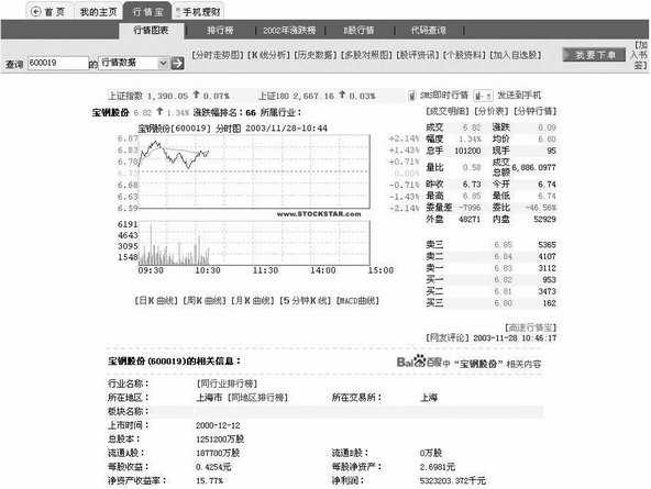如果要查看“宝钢股份”的行情数据,我们只要输入它的代码“600019”,并选中“行情数据”,单击“查询”按钮,就可以看到详细的行情数据(图1)。单击相应的栏目链接,还可以看到该股票的历史数据、股评资讯、个股资料等。