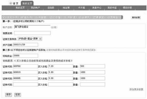 在“我的主页”页面中,点击“我的账户”来创建自己的持仓组合,通过“账户管理系统”进行财务管理。使用的时候,首先点击“新建账户”,接着输入“账户名称”(最多可建八个账户),选择证券交易种类,添加初始资金,输入买入股票的代码、买入价格及数量(图2),最后单击“保存”按钮即可。