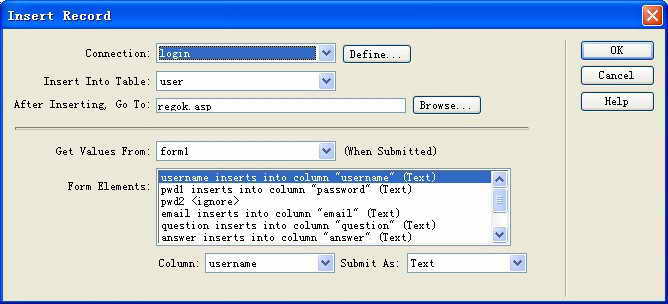 (1)选择“Window→Server Behaviors”命令,打开服务器行为面板。单击‘+’按钮,选择‘Insert Record’单击,弹出‘Insert Record’对话框。进行如图1的设置。