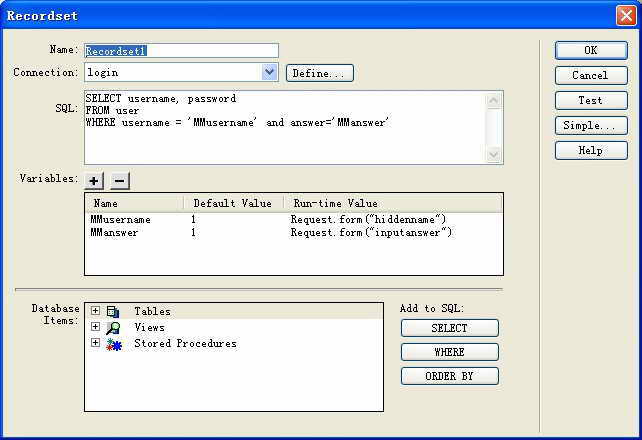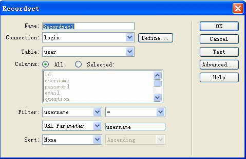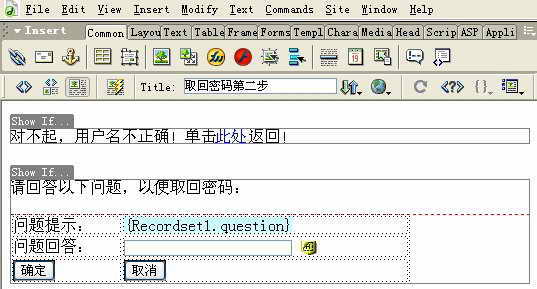 if(!(x=d[n])&&d.all) x=d.all[n]; for (i=0;!x&&i for(i=0;!x&&d.layers&&i if(!x && d.getElementById) x=d.getElementById(n); return x; } function MM_validateForm() { //v4.0 var i,p,q,nm,test,num,min,max,errors='',args=MM_validateForm.arguments; for (i=0; i<(args.length-2); i+=3) { test=args[i+2]; val=MM_findObj(args[i]); if (val) { nm=val.name; if ((val=val.value)!="") { if (test.indexOf('isEmail')!=-1) { p=val.indexOf('@'); if (p<1 || p==(val.length-1)) errors+='- '+nm+' 必须输入有效E-mail地址。\n'; } else if (test!='R') { num = parseFloat(val); if (isNaN(val)) errors+='- '+nm+' 必须输入数字。\n'; if (test.indexOf('inRange') != -1) { p=test.indexOf(':'); min=test.substring(8,p); max=test.substring(p+1); if (num } } } else if (test.charAt(0) == 'R') errors += '- '+nm+' 必须输入内容。\n'; } } if (MM_findObj('pwd1').value!=MM_findObj('pwd2').value) errors += '-两次密码输入不一致 \n'; if (errors) alert('您的输入有以下错误:\n'+errors); document.MM_returnValue = (errors == ''); } //--> </script> 在页面中设计包含“请输入您的注册用户名”的提示文字和一个输入框、一个确定按钮和一个清除按钮的表单,并将属性面板中的用户名的文本域命名为“username”,Max Chars的值为20。选择表单,在属性面板的Action文本框中输入“question.asp”,“Method”中选择“Post”为提交方式。 在页面中设计包含“问题提示”和“问题回答”两个输入框和“确定”、“清除”两个按钮的表单,并在属性面板的Action文本框中输入“Showpwd.asp”,“Method”设为“Post”。将问题回答的文本框域命名为“inputanswer”。 (1)打开“Bindings”面板,单击“+”按钮,从中选择“Recordset(Query)”单击,在弹出的对话框中进行如图2所示的设置。设置完后单击“Advanced”按钮,将“Variables”中“Run-time Value”的Request.Querystring("username") 改为Request.form("username"),如图3。 (2)选择Recordset1记录集中的“question”,并拖放到页面中问题提示的后面。 (3)选择“Insert→Form Objects→Hidden Field”命令,在表单中插入隐藏域,将属性面板中的名称“hiddenField”改为“hiddenname”。单击面板中的闪电图标,在弹出的“Dynamic Data”对话框,选择Recordset1记录集中的“username”。 (4)在文档窗口中选择当用户名存在时要显示的内容,然后单击服务器行为面板中的“+”按钮,选择“Show Region→Show Region If Recordset Is Not Empty”命令,打开“Show Region If Recordset Is Not Empty”对话框,从中选择“Recordset1”,单击“OK”。 (5)在页面上部输入当用户名不存在时显示的文本“对不起,用户名不正确!单击此处返回”,选择文本后,进行如图4的文件链接操作。 四、取回密码部分的制作