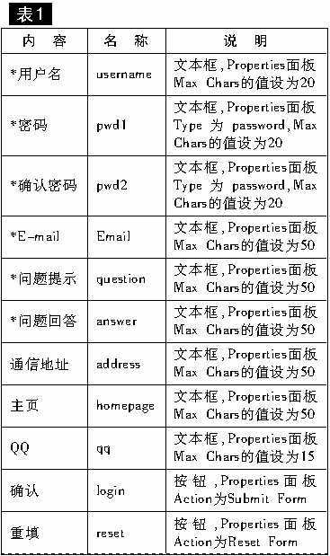 在页面中插入一个“Form”,然后设计表格,并向表格中加入文字与表单元素,其中文字前有“*”的是让注册者必须填写的,具体内容见表1。