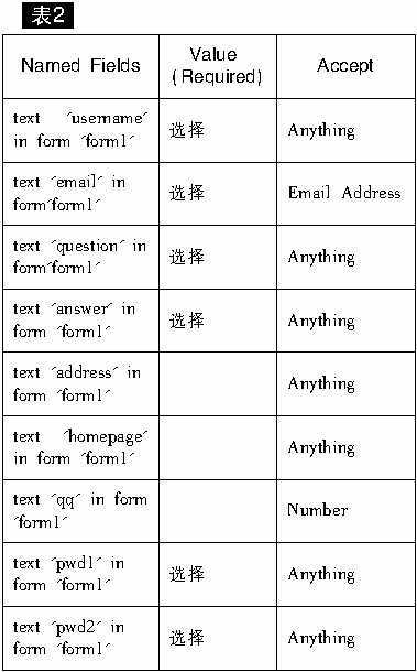 打开行为面板,单击“+”按钮,从中选择“Validate Form”打开对话框,各部分设置如表2。