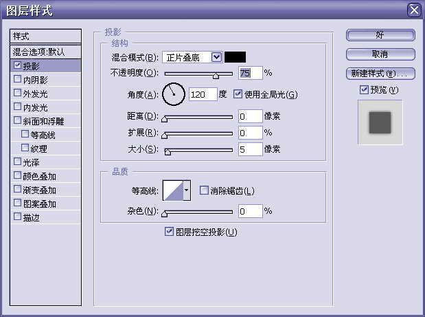 现在选择另一字体输入你的名字,调整字体的大小及位置并设置阴影效果(提示:选择字体图层,并点击图层面板最下方第一个“添加图层样式”按钮选择“阴影”),进行如图3所示的设置并在其后加入英文字体“DE”。