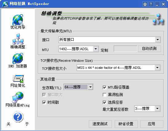 如果你是一位“高手”,利用《网络狂飙》的“精确调整”功能,可以精确地优化网络。单击“精确调整”按钮,弹出如图1所示窗口。