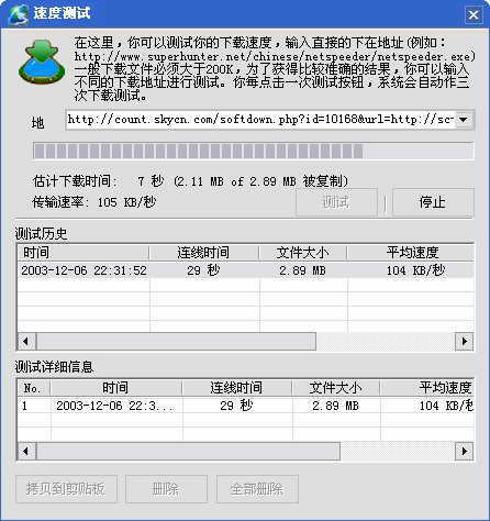 如果你不知道现在的下载速度,就可以通过“测试速度”来测试某个网站的下载速度。单击“测试速度”按钮(图2)。在“地址”框中输入某个软件的下载网址,然后单击“测试”即可开始测试该站点的下载速度。