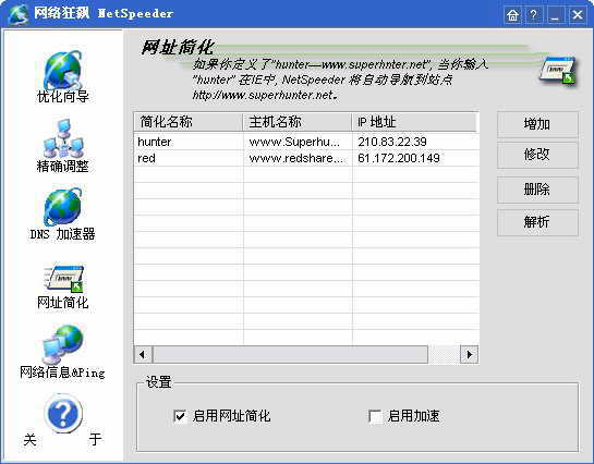 在输入某个网页网址时,如果该网址非常长,则既不容易记忆,又容易输入出错。在《网络狂飙》里可以使用一个字母或是一个单词来代替整个网址。单击“网址简化”,在弹出的窗口中(图3)点击“增加”按钮,弹出一个窗口,在该窗口中分别输入网址和简化后的字母或单词即可。通过“解析”按钮即可将该网址对应的IP地址解析出来。设置完成后,我们就可以通过简化了的网址浏览网页了。