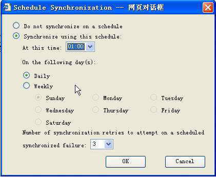 建议大家选择自动同步,点击“Synchronization Schedule”按钮,在弹出的对话框中选择“Synchronize using this schedule”,然后设置同步的日期和时间,建议大家在每天凌晨进行同步(图1)。