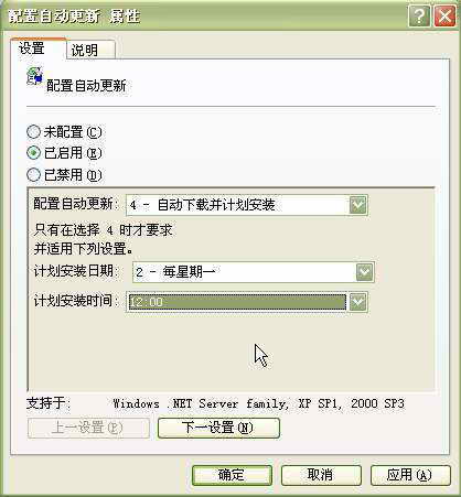 双击“配置自动更新”策略,进入属性对话框(图2),在这里我们可设置进行更新的时间和处理方法,默认是“未配置”的。在对话框中勾选“已启用”选项,在“配置自动更新”下拉列表中选择“4-自动下载并计划安装”,接着根据用户的需要在下面的“计划安装日期”和“计划安装时间”栏中选择合适的日期和时间,最后点击“确定”按钮以保存设置。