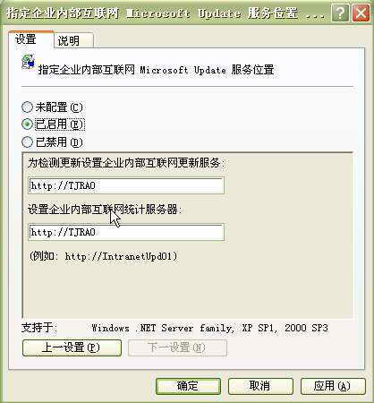 进入“指定企业内部互联网Windows Update服务位置”策略的属性对话框(图3),选择“已启用”选项,然后在下面的输入框中指定SUS服务器的位置,可以使用SUS服务器的名称或IP地址,如在输入框中输入“http://192.168.0.10”或“http://TJRAO”,最后点击“确定”按钮。