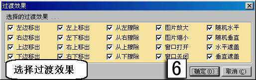 ⑥点击“过渡效果”,并在出现的“过渡效果”对话框中选择屏幕保护图片的过渡效果(一般是全部选定)后点击“确定”。