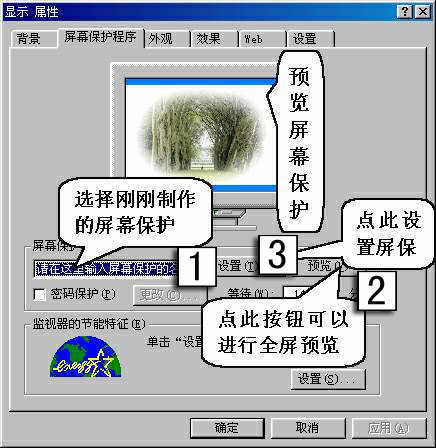 ①点击此按钮可以在全屏状态下预览你制作的屏保。
