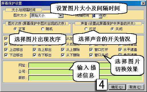 ④在“屏幕保护设置”对话框中还可以对图片和声音的切换方式以及描述信息重新设置,满足不同用户的需要。