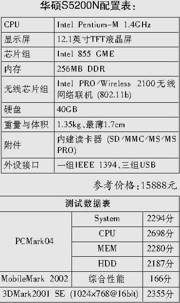 S5200N拥有主流的迅驰构架,CPU采用了1MB二级高速缓存的Pentium-M 1.4GHz处理器,配备了256MB的DDR内存以及40GB容量的硬盘。机器内部采用了集成图形核心的Intel 855GME芯片组;另外,它集成了802.11b规范的Intel无线网络模块。S5200N提供了内建以及外置的两组电池模块,一组电池容量为2200mAh,资料显示待机时间为2.5小时;另一组为4400mAh,待机时间为7.5小时左右。