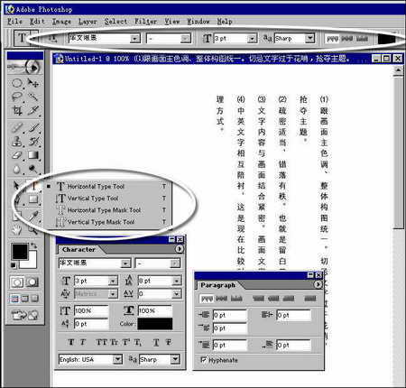 在Photoshop的工具面板中用鼠标按住文字工具不放,在弹出的扩展选项里,有四个选项,分别是实体与空心横竖的两种排列方式。这里需要注意的是当你选择空心的文字,最好是一次性调整好文字的大小和颜色,一旦确定后它将由向量文字变为点阵文字,不能再次修改。而实体的文字在你还没有变为点阵文字前,可以反复修改。图2是Photoshop中对文字所涉及的控制选项设置以及界面。我们后面的所有设置都将在这里进行。