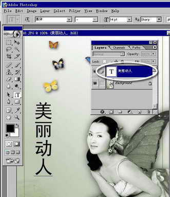 在工具箱中选择文字工具,此时在属性控制面板上你可以设置各项文字的属性。这里我们选择竖排。将文字工具移到图像窗口中,点鼠标出现插入的符号就可以输入文字了。在你输入完文字后你再调出图层控制面板,你会发现在图层面板中多了个文字图层(图3)。