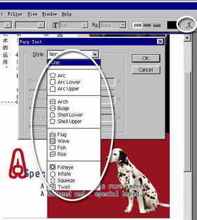选取文字工具,输入一段文字,然后在属性控制面板中点文字变形设置按钮(图5),在弹出的文字变形设置对话窗口中,你可以在样式菜单下选择15种不同的封套方式来对文字进行变形处理。