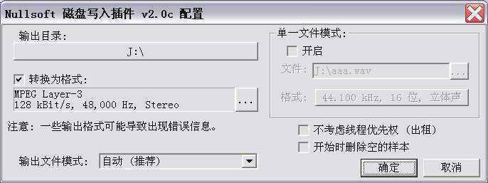 2.右击Winamp主窗口的“选项→参数设置”,在“Winamp参数设置”对话框中选择:“插件→输出→NullSoft磁盘写入插件”,单击“配置”按钮,在其对话框中选择压缩后的文件输出目录和压缩时所使用的参数。(注意:如果开启“单一文件模式”的话,则会将播放列表中的所有音乐文件都压缩并保存在一个MP3文件中。)