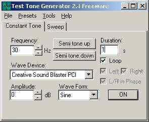 在固定频率输出(Constant Tone)的“Frequency”项里输入一个数值,一般在20到50间即可,然后选中“Loop”,在“Duration”里设置一个时间,这里笔者设置的是“1”,把“Wave Form”设置为“Sine(正弦波)”,“Amplitude”设为“0”(图1),最后把耳机插在声卡上,让耳机长时间工作即可。