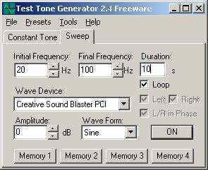 在扫描频率(SWEEP)的“Initial Frequ1ency”里输入起始频率,在“Final Frequency”里输入结束频率,笔者认为从20Hz到100Hz比较合适,在“Duration”里输入扫描一次所用的时间(图2),其他的操作和固定频率法一样。