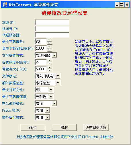 下载软件安装后,直接运行“BitTorrent 属性设置”,打开“高级设置”,如图所示。为了使硬盘损坏最小以及降低CPU消耗,你可以选择“文件安置方式”为“预分配”;“写缓存大小”一般可设为5MB(如果内存够大,设大点效果更好);将“Psyco模块”启用(拥有大内存时启用)。别看只有几项参数,它的写缓存功能,能有效减少下载时随机写入造成硬盘频繁寻址,大幅提高硬盘寿命;还大幅降低内存占用, 降低最小化时CPU占用率,提高程序效率。