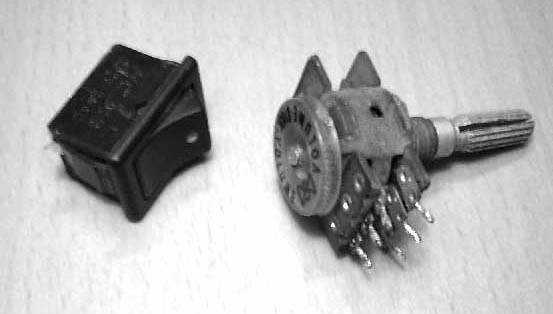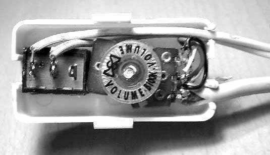 下面的工作就是安装了。在小塑料盒上开孔,将音量电位器和电源开关按个人喜好装置在小塑料盒中(图6),为了美观,可以在旧家电上拆一个电位器旋钮套在电位器轴上,如图7。