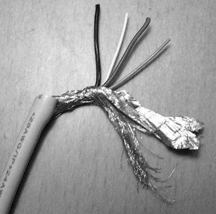第三步:理出USB延长线内的四根引线,如图4,我们可以发现其中共有四根芯线和一根屏蔽线。选定其中的某两根作为音频引出线(比如选定黑线和红线),将这根线分别接在音箱内的两根音频输入线端,USB线内的另两根引线作为音频送回端,将它们分别焊接在至功放板的输入端的屏蔽线上(就是被焊开的音频输入线)。然后再将开关线串在音箱原来的电源开关断开点。