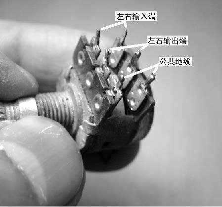 第四步,将USB线的另一端输入和输出线对应焊接在双联电位器的各焊点上,双联电位器引脚示意如图5所示,不要焊错。将屏蔽作为公共地线焊在电位器上。将开关线直接焊接在小开关上,整个线路焊接完成。