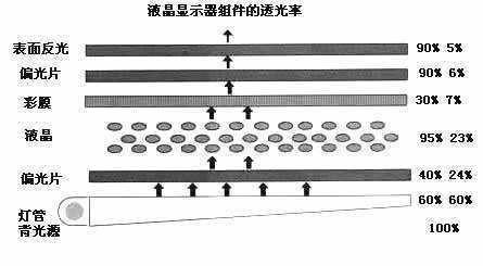 导光板是用射出成型的方法将丙烯压制成表面光滑的楔形板块,然后用高反射率且不吸光的颜料,在导光板底面以网版印刷印上圆形或方形的扩散点。冷阴极管位于导光板厚侧的端面,光进入导光板后,大部分的光利用全反射往薄的一端传导。当光线在底面碰到扩散点时,反射光会往各个角度扩散,破坏全反射条件而自导光板正面射出,疏密、大小不同的扩散点图案设计,可使导光板面均匀发光。扩散片的作用是让射出的光分布更加均匀,使从正面看不到反射点的影子。反射板则将自底面漏出的光反射回导光板中,以增加光的使用效率。进入导光板内的光大约有80%可自正面射出。因此,经过过滤、分散,显示器的输出亮度要远远低于背光源的高度值,如果背光源的亮度为5000cd/m2的话,那么显示器的最终亮度可能只有300cd/m2左右(图3)。因此我们平常所说的“亮度就是背光光源所能产生的最大亮度”是一种错误的说法。