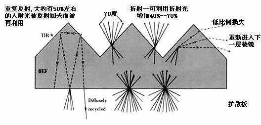 棱镜膜的作用就是让分散的光集中在法线70度范围内出光,其原理是利用全发射定律,让大于70度射出的光又反射回来再次被利用,可使轴中心的亮度增加110%,整个过程就是利用折射和全反射原理使分散的光线集中于一定的角度从背光源中发出。用过笔记本电脑和台式液晶显示器的人都会发现,显示屏存在一定的视角。从垂直于显示屏平面的方向观察显示屏,亮度较高;但从偏离法线一定角度观察,会发现亮度不是很高。这也合乎用户的使用要求,因为笔记本电脑通常是个人用,这就要求本来分散的光通过一些方法集中到中心观察角度范围内,使在轴中心亮度大大增加,而棱镜膜就是起这样的作用。